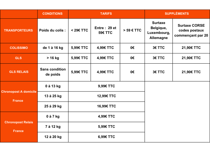 4)Tableau de tarifs et délais d'expéditions