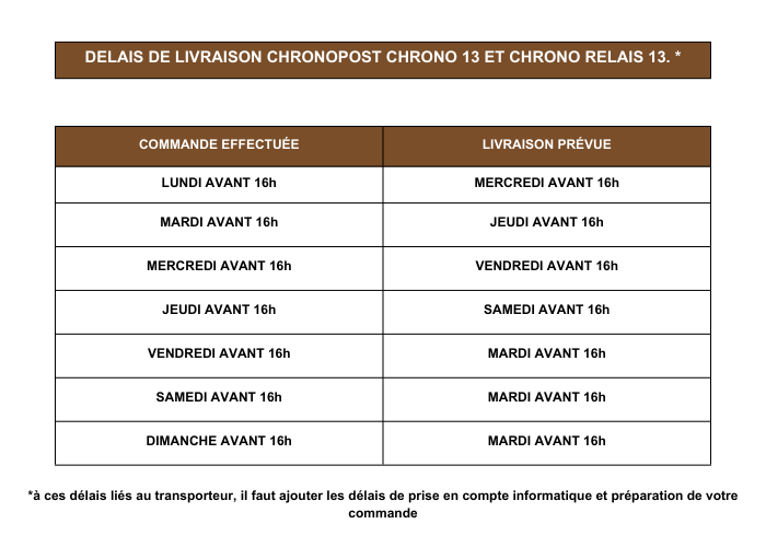 - Passez vos commandes en début de semaine pour le recevoir dans la semaine de la prise de commande, cela évite des délais supplémentaires liés aux week-end ou jours fériés.